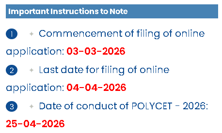 Until sending AP POLYCET application forms the students are requested to read the following points carefully which are as follows: AP POLYCET Exam Dates 2026 are available online only and will be available from 3rd Mar 2026. So, don’t be late to send forms.