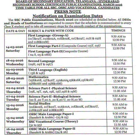 The office of the Director of Government Examinations of Telangana state has announced the TG 10th class time table 2026. The exams are set to be held in the month of March. These exams will start from 14th March and be conducted between 09:30 PM to 12:15 PM/12:45 PM.