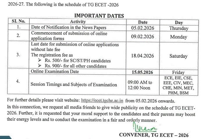 “TG ECET 2026” Commencement of submission of online application form 09-02-2026