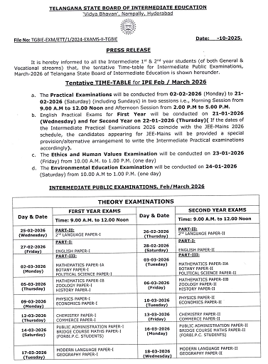 TG Intermediate Time Table 2026 released by the Telangana State Board of Intermediate Education on 31-10-2025, second language paper for first-year students will be held on Feb 25th and for second years on the next day. Timings for IPE 2026 exams is from 9 am to 12 pm.