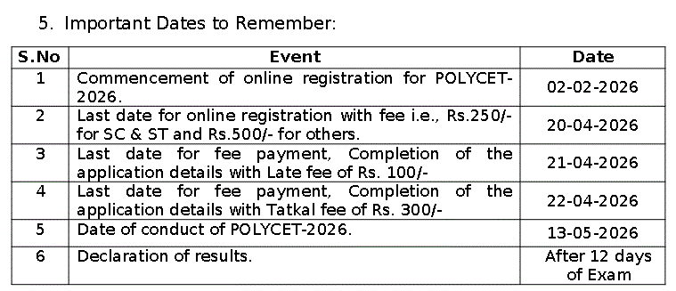 - TG POLYCET Exam Dates 2026 are available online only and will be available from 20th of Apr 2026. So, don’t be late in submitting forms